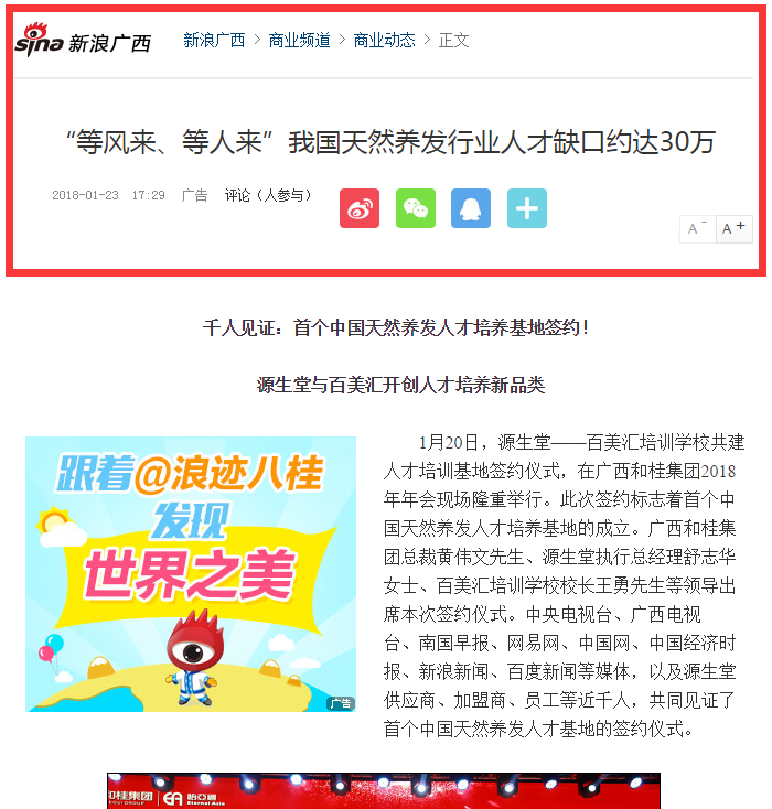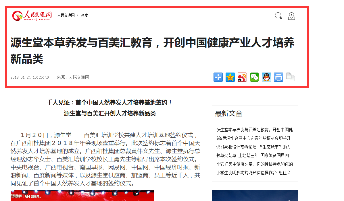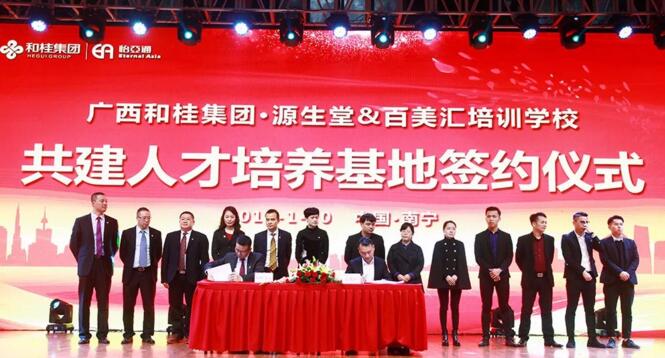 1月20日,源生堂與百美匯培訓(xùn)學(xué)校共建人才培訓(xùn)基地簽約儀式,在廣西和桂集團(tuán)2018年年會現(xiàn)場隆重舉行。此次簽約標(biāo)志著首個中國天然養(yǎng)發(fā)人才培養(yǎng)基地的成立。廣西和桂集團(tuán)總裁黃偉文先生、源生堂執(zhí)行總經(jīng)理舒志華女士、百美匯培訓(xùn)學(xué)校校長王勇先生等領(lǐng)導(dǎo)出席本次簽約儀式。中央電視臺、廣西電視臺、南國早報、網(wǎng)易網(wǎng)、中國網(wǎng)、中國經(jīng)濟(jì)時報、新浪新聞、百度新聞等媒體,以及源生堂供應(yīng)商、加盟商、員工等近千人,共同見證了首個中國天然養(yǎng)發(fā)人才基地的簽約儀式。